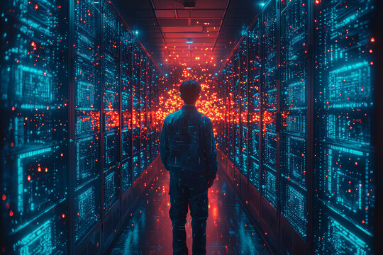 Server racks glowing blue inside secure data center facility with technician monitoring systems. Concept of digital infrastructure.