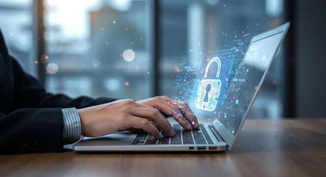 Person typing on a laptop with a digital padlock overlay representing cyber security concept shown on screen