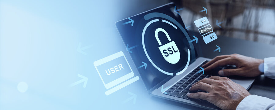 SSL security concept with user typing on laptop and digital padlock icon overlayed.