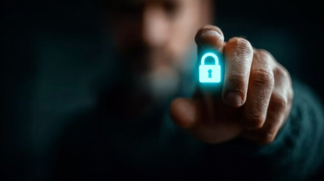 Confident hand touches glowing digital lock icon representing data security and digital protection in a modern tech concept