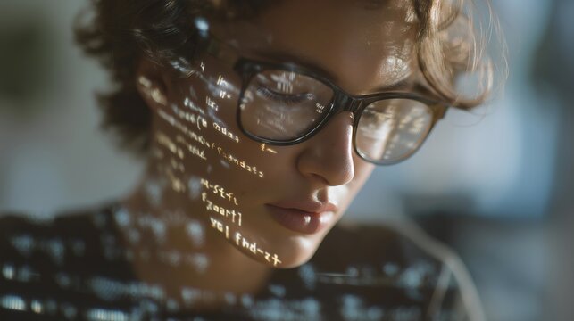 A student silhouette double-exposed with code, equations, and holographic interfaces, illustrating digital education, STEM careers, and future skills. cinematic color correction, natural uneven