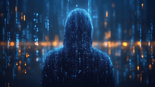 Anonymous hacker silhouette against glowing digital matrix and data stream background