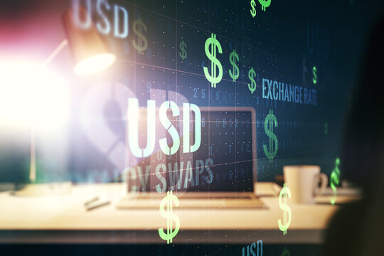 Creative EURO USD symbols illustration on modern computer background, forex and currency concept. Multiexposure