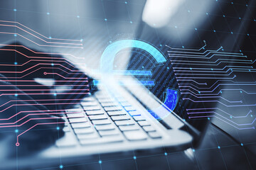 Close up of hands using laptop with glowing euro hologram and lines on blurry background. E-commerce, online banking, cryptocurrency and finance concept. Double exposure.