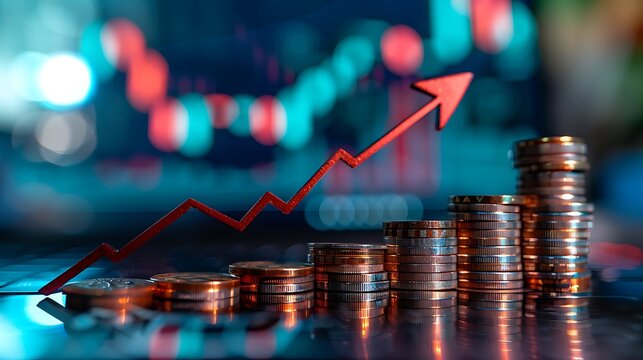 A close-up macro photograph of a stack of silver coins positioned diagonally on a blue digital financial chart background.