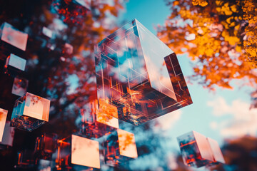Floating cubes layered with digital glitch textures