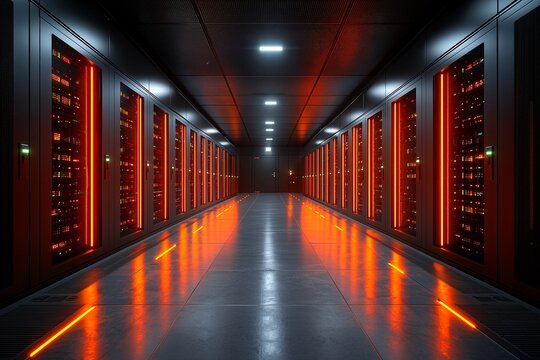 Illuminated server room with rows of computer servers and data storage equipment, showcasing modern technology and data center infrastructure