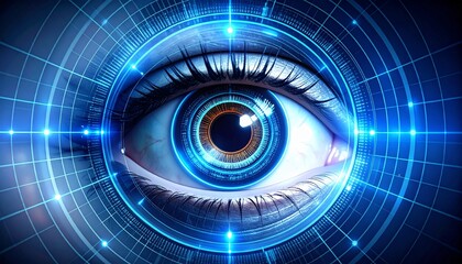 Futuristic human eye with digital interface overlay in abstract background