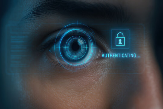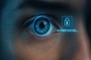 Multi factor authentication password security biometric eye scan interface uses futuristic iris recognition and glowing hud to protect personal data and enable secure access with calm confident