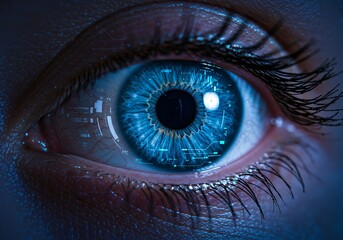 The high tech close up image captures the intricate details of a human eye, with a mesmerizing digital data reflection overlay
