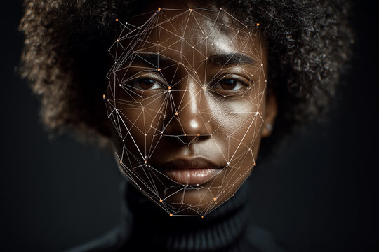 Close-up of a woman's face with digital facial recognition overlay, showing geometric patterns and data points. The background is dark, emphasizing the technology interface.
