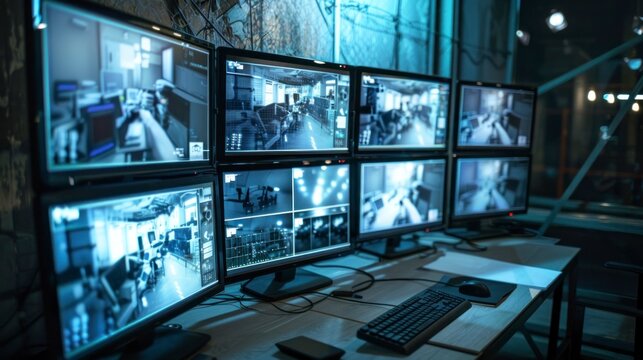 Surveillance Camera CCTV Footage, Multiple Screens Show People working in the Office. High Tech Security and Data Protection Mock-up. Screen Replacement Template for Computer Displays