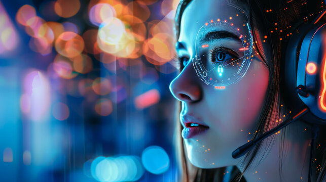 Business woman sitting in a futuristic office desk with advanced AI face recognition screens, technology AI connectivity infographic background