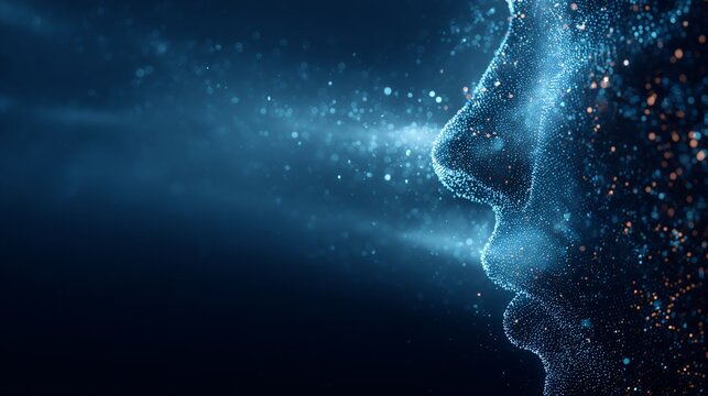 Abstract digital human face formed by glowing data points symbolizing artificial intelligence and analytics.