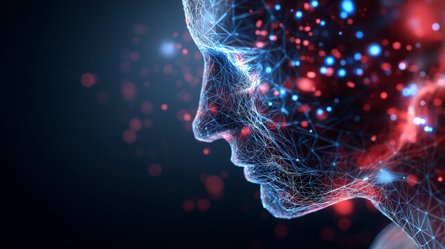Futuristic Digital Human Face Profile with Abstract Neural Network Patterns and Glowing Data Points