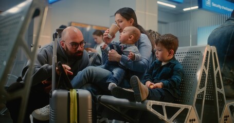 Crowded Airport Terminal: Woman with Two Little Children Watching Cartoons on Digital Tablet, Waiting for Airplane Flight. Man Bringing Coffee to Wife. Diverse People in Boarding Lounge of Airline Hub
