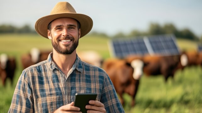 Farmer wearing straw hat feeding free range chickens in sunlit paddock at golden hour