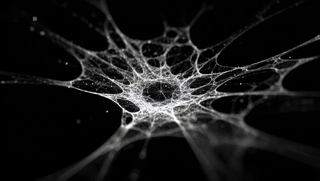 Intricate network of interconnected filaments, radiating from a central point.  Light gray lines and specks create a spiderweb-like structure against a black background.