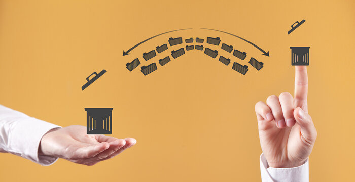 Businessman using smartphone with digital trash bin icon and deleting files representing data management cybersecurity privacy storage cleanup document removal and information security concept. file