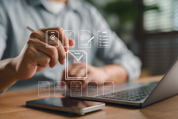 Checklist and document management system concept with digital quality control. Man using tablet and laptop to verify online forms, audits, and workflow approval with futuristic interface icons.