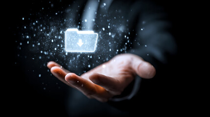 Human Hand Presenting Floating Digital Folder Icon Representing Cloud File Transfer