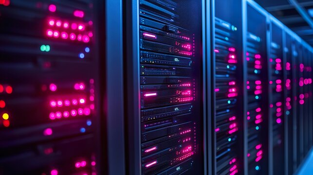 Rows of network servers are illuminated by bright LED lights in a modern data center. This high tech setting highlights the complexity of data infrastructure in operation.