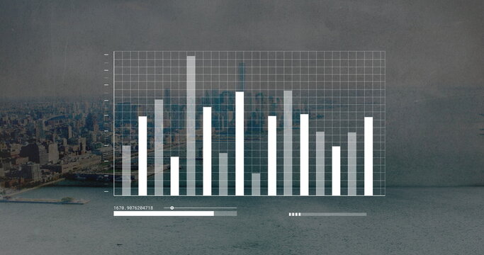 Data overlay showing candlestick and bar graphs over urban skyline, with numeric markers and gauge