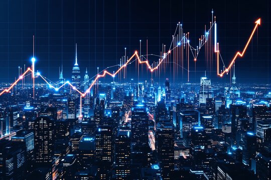 Glowing stock market graph lines over a city skyline at night with a digital grid background, symbolizing financial growth, data analysis, and business trends