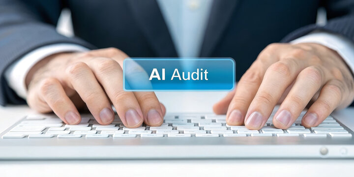 Professional hands in suit typing on white keyboard with transparent AI audit button, representing technology, business, and digital compliance in modern office environment