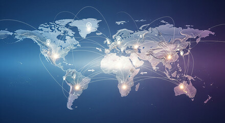 A futuristic digital world map with interconnected glowing lines representing a global network of data and communication, illustrating advanced technology and modern connectivity
