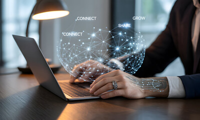 Hands Typing on Laptop with Digital Data Visualization Overlay
