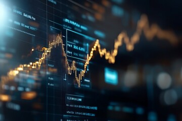 A glowing stock market chart illustrating peak data points among digital panels, symbolizing financial analysis and market trends in a dynamic environment.