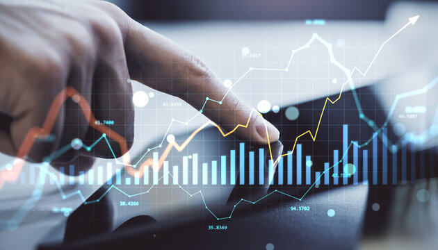 Business hand analyzing financial stock market data with digital graph overlays on a tablet screen in modern economic technology concept.