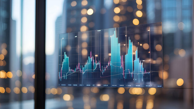 Abstract financial data visualization with fluctuating graphs and charts displayed on a digital screen.