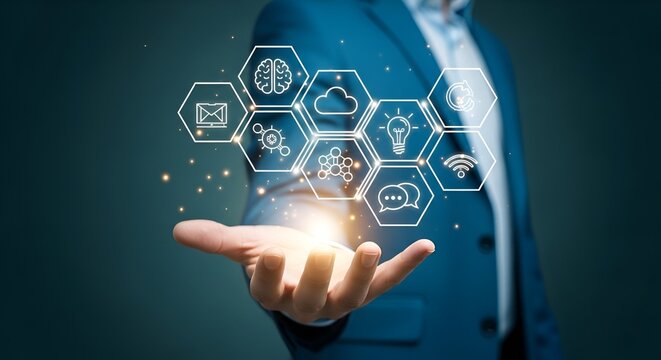 A professional hand interacts with a glowing digital interface featuring various icons that symbolize technology and data connections in a modern business context. Tessel