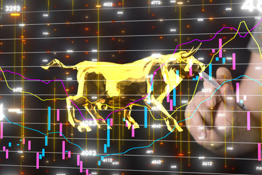 Colorful abstract visualization of financial stock market chart with glowing candlestick patterns and moving averages. Concept of economy, investment, volatility and digital trading analysis.