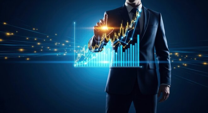 A businessman interacts with a glowing, futuristic financial graph showing growth and success. Represents data analysis, market trends, investment, and technology in business.