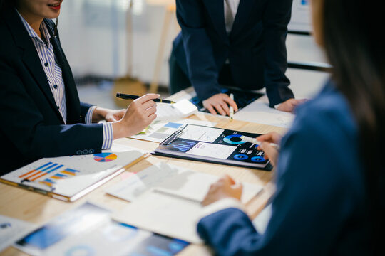 Business people having a meeting, analyzing financial charts and graphs using digital tablet and document, brainstorming and discussing about new business project