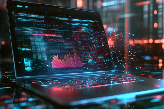 Conceptual illustration of financial data flying out of a laptop with futuristic holographic elements.