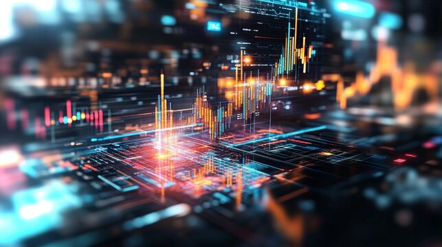 3D digital graph analysis showing growth strategy with financial chart data and stock market trends, illustrating advanced financial technology and investment