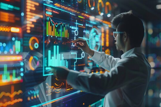 A businessman utilizes digital augmented reality to analyze the profitability of companies in 2024, showcasing positive financial indicators for long-term investments