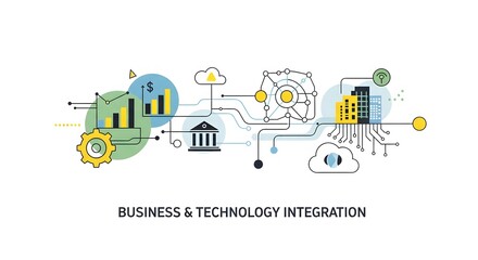 Business and technology integration concept with icons representing data, cloud, and network
