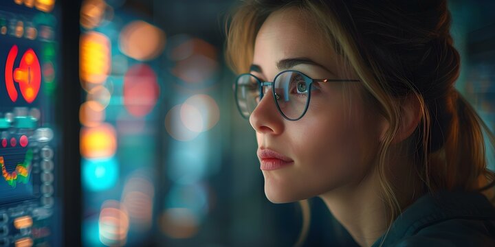 Modern business woman analyzing financial data in futuristic workspace
