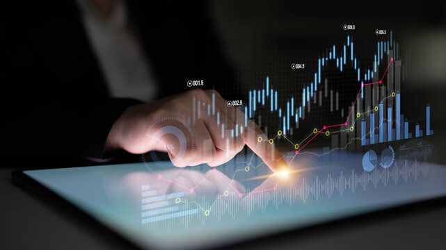 A professional using a tablet to analyze market trends, featuring interactive graphs and data visualizations for financial insights in a dark setting. Scalp