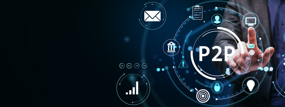 Businessman touching P2P interface with fintech icons and digital data analytics on a futuristic technology screen on dark background concept.
