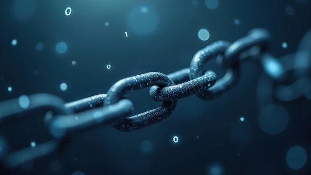 Digital Blockchain: Close-up of Metal Chain with Binary Code Overlay, Security Concept