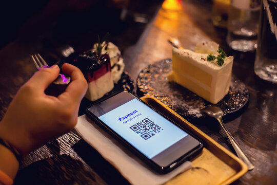 Selective focus to QR code payment tag on smartphone with blurry cake and dessert in restaurant for accepted generate digital pay without money. Qr code payment concept.