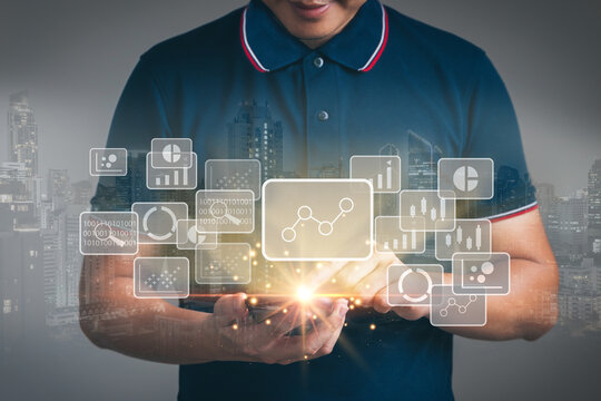 Man with using hand to touch communication graph technology icon interface on his mobile phone. Planing financial analysis marketing communication technology concept.