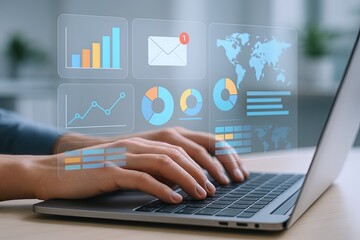 Modern digital business analytics interface with charts graphs and data on screen.