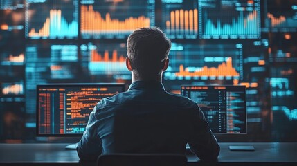 Analyst Monitoring Data on Multiple Screens in High-Tech Office for Financial Insights